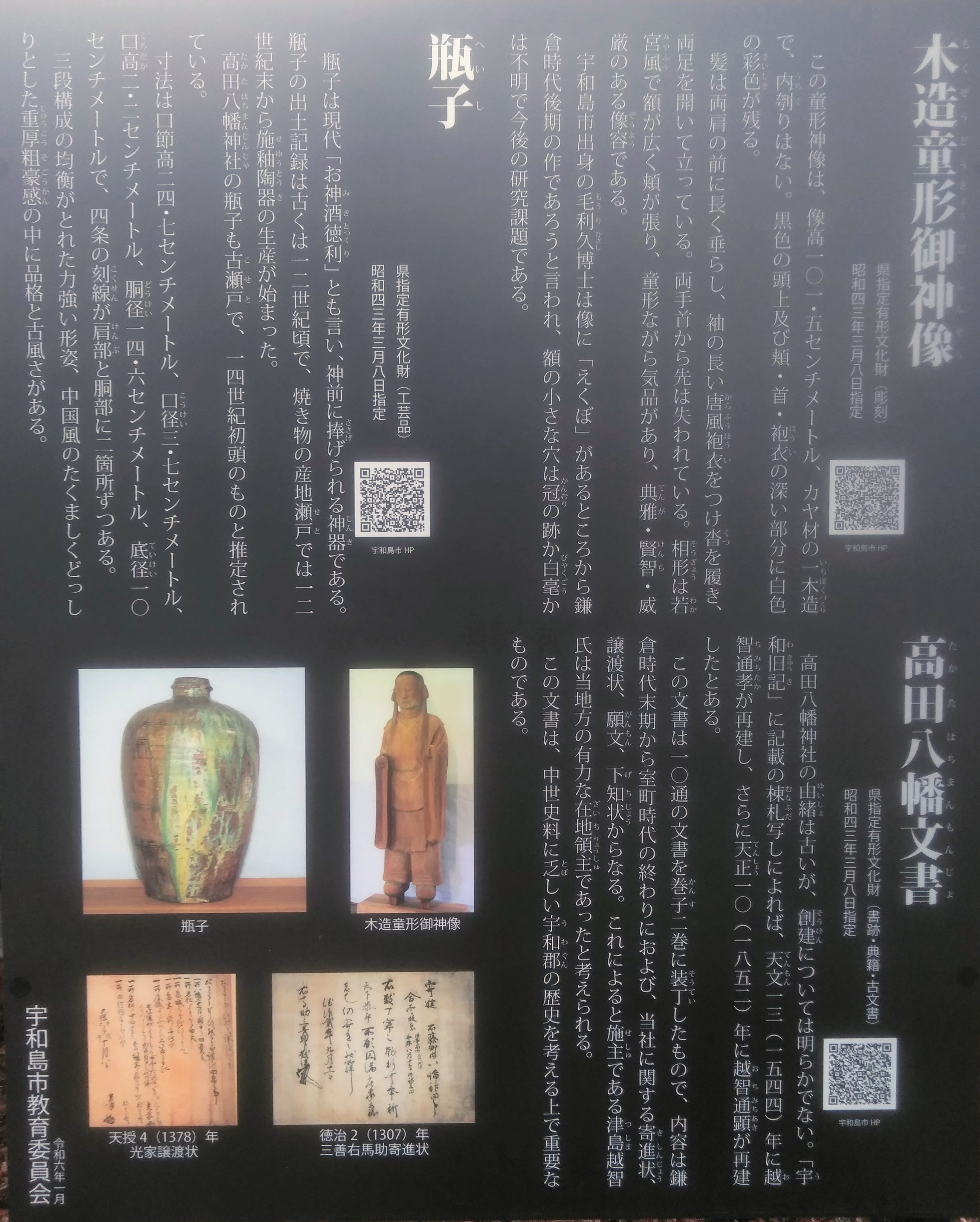 【宝物】 童形御神像、高田八幡文書、瓶子(以上県指定文化財)、棟札二枚、獅子頭(以上町指定文化財)、太刀