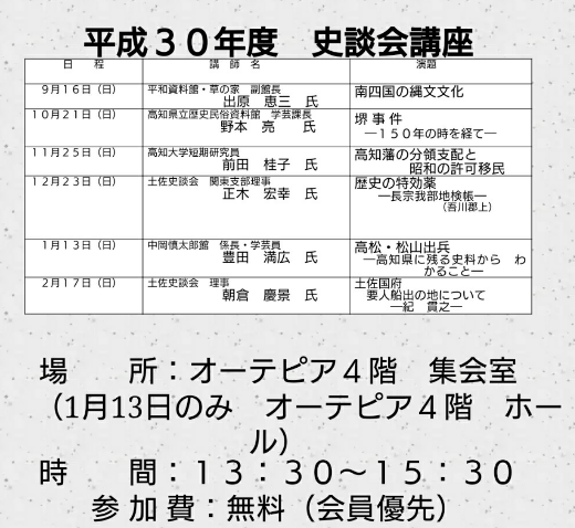 12月23日(日)に土佐史談会関東支部理事・正木宏幸氏による「歴史の特効薬ー長宗我部地検帳ー(吾川郡 上)」と題する平成30年度史談会講座がオーテピアで開かれる。どのような切り口で語られるのか楽しみである。