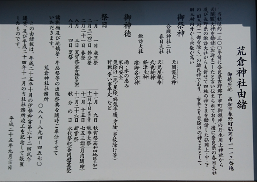 高知市春野町弘岡中1113に鎮座する荒倉神社は、約1300年前に吉野の丹生川上神社から天闇靇大神を勧請したと言い伝えられている。後に春日大社および諏訪大社からも併せて四柱の神様を勧請している。