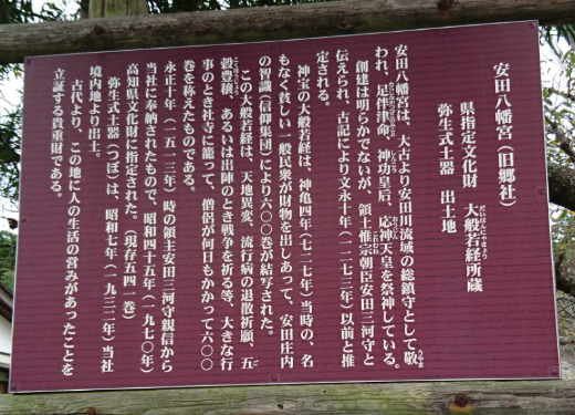 安芸郡安田町安田2170の安田八幡宮は安田町役場の道路を隔てた西側にあった。安田川の河口付近で、かなり海に近い場所である。『南路志』に「正八幡宮」と記され、単なる「八幡宮」よりは歴史が古く、九州との関係が深いとする指摘もある。
