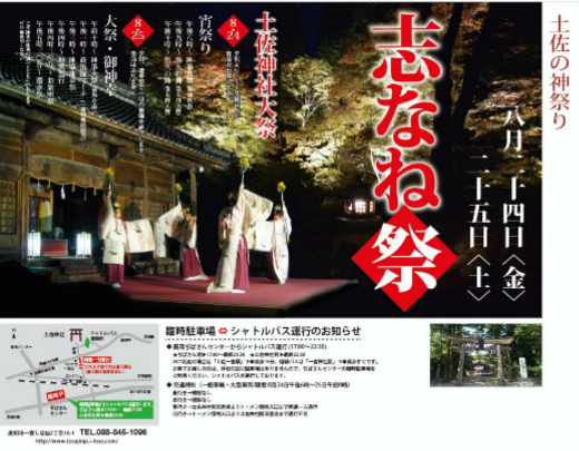 土佐神社の公式ページによると「旧暦七月三日の祭です。しなねの語源は諸説あり、七月は台風吹き荒ぶことから風の神志那都比古から発したという説、新稲(しいね)がつづまったという説、さらに当社祭神と関係する鍛冶と風の関連からとする説等があります」とのこと。