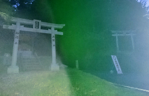 日が昇る前から場所探し。相川に来てみると杖立神社の案内の矢印が道中にある。とりあえず矢印に従って行くと山中の剣神社と金毘羅神社が見つかった。その間の道が杖立神社道となっており、車両通行禁止。